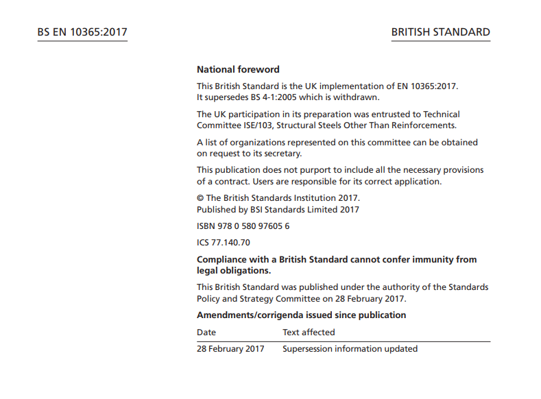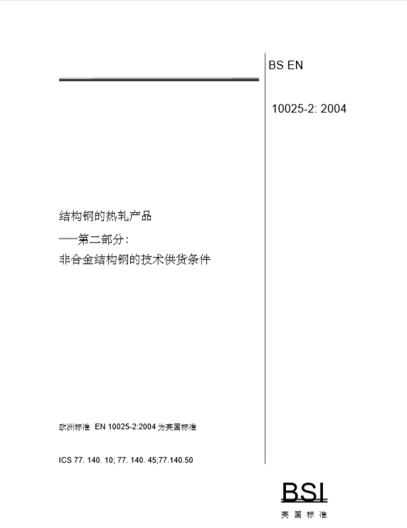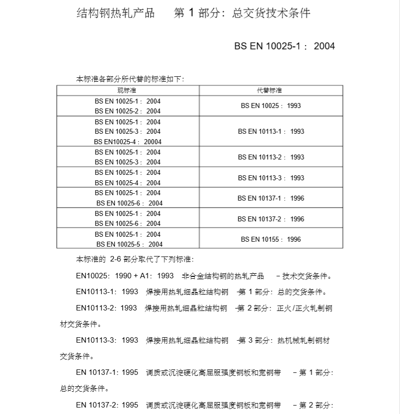 结构钢热轧产品 第 1 部分:总交货技术条件 BS EN 10025-1 : 2004 本标准的 2-6 部分取代了下列标准:EN10025:1990 + A1:1993